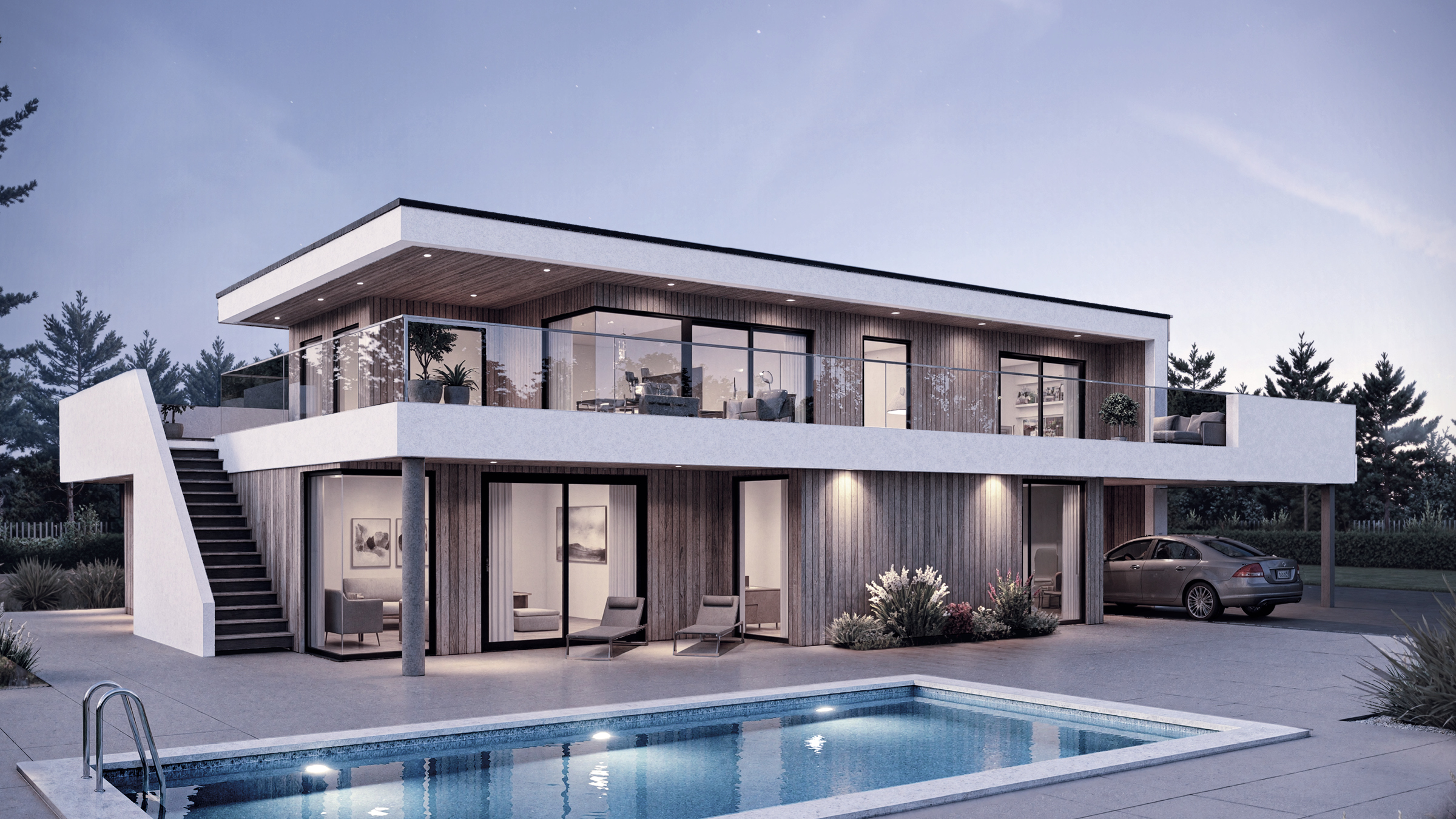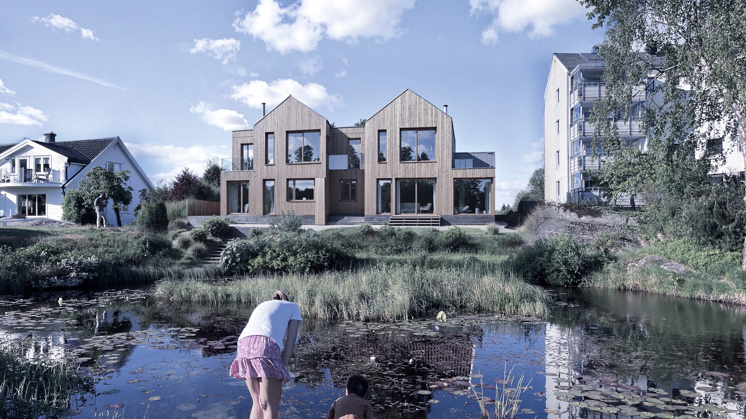 Enebolig med hybel, utviklet gjennom dispensasjon for å realisere et moderne og helhetlig boligprosjekt med høy arkitektonisk kvalitet.